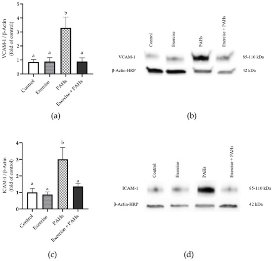 Relative protein expression of adhesion molecules in aortic tissue. (a) Relative protein expression of VCAM-1 p = 0.006 (control vs. exercise p = n.s.; control vs. PAHs p = 0.034; control vs. exercise + PAHs p = ns, exercise vs. PAHs p = 0.020, exercise vs. exercise + PAHs p = n.s.; PAHs vs. exercise + PAHs p = 0.024) K-W. (b) Representative image of VCAM-1 blotting and β-actin loading control. (c) Relative protein expression of ICAM-1 p = 0.003 (control vs. exercise p = n.s.; control vs. PAHs p = 0.010; control vs. exercise + PAHs p = n.s.; exercise vs. PAHs p = 0.007; exercise vs. exercise + PAHs p = n.s.; PAHs vs. exercise + PAHs p = 0.030) A. (d) Representative image of the blotting of ICAM-1 and the β-actin loading control. Data are presented as mean ± SEM. Different letters show statistically significant differences. A Ordinary one-way ANOVA with Tukey’s multiple comparisons test. K-W Kruskal–Wallis with Dunn’s test multiple comparison analysis. (n = 10 per group).