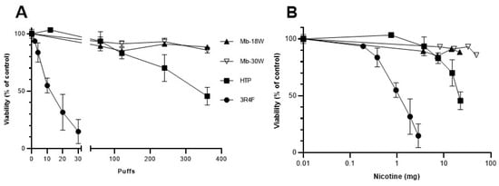 3.1. Evaluation of the Cytotoxicity after Exposure to E-Cig or Tobacco Product Emissions