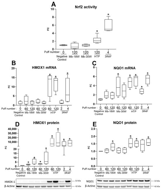 3.2. Study of Oxidative Stress after Exposure to E-Cig or Tobacco Product Emissions