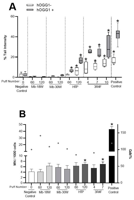 - Thorne, D.; Whitwell, J.; Clements, J.; Walker, P.; Breheny, D.; Gaca, M. The Genotoxicological Assessment of a Tobacco Heating Product Relative to Cigarette Smoke Using the in Vitro Micronucleus Assay. Toxicol. Rep. 2020, 7, 1010–1019. [Google Scholar] [CrossRef]