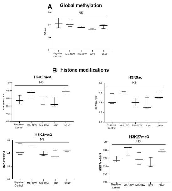 3.4. Study of Impact of E-Cig or Tobacco Product Emissions in Global DNA Methylation and Histone Modulations