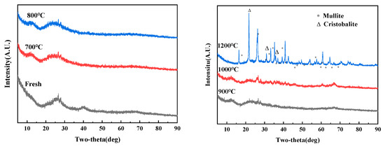 Self-sintering experiments were performed on the allophanes at different temperatures. The XRD patterns of allophanes with different sintering temperatures are shown in Figure 2. No obvious diffraction peaks were observed in the XRD patterns of fresh allophane, indicating that allophane was an amorphous substance. Two weak diffraction peaks were observed at 26.6° and 28°, which may be attributed to the spherical shell structure of allophane, comprising silica and alumina, characterized by short-range ordering. When the sintering temperature was lower than 1000 °C, wide and diffuse peaks were observed in the XRD pattern, suggesting no mineral-phase transformation or crystal-phase substance formation under these experimental conditions. After sintering at 1200 °C, the main crystal phases in the self-sintering products of allophane were primarily transformed into two phases, namely, mullite (Al6Si2O13) and cristobalite (SiO2). The increase in the sintering temperature may have caused the Si–O–Si and Si–O–Al bonds to break and the allophane framework to collapse. The decomposition products Al2O3 and SiO2 with high chemical reaction activity also recrystallize at high temperatures to yield a mullite crystal phase [26,37]. The content of the cristobalite crystal phase was relatively low, and the cristobalite phase may be attributed to the high-temperature calcination of excessive SiO2 [38]. Moreover, the volume reduction rate of the sintered solidified body increased from 20.6% to 52.2% with increased sintering temperature from 700 °C to 1000 °C. This phenomenon has benefited waste minimization and improved economic efficiency. Hence, the formation of stable crystalline phases and good volume reduction rates indicate that allophane has excellent self-sintering properties, making it a potential matrix material for the solidification of radionuclide ceramics.