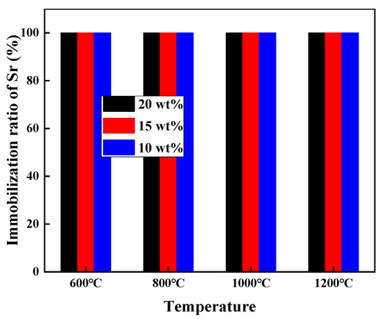Figure 3 shows the Sr immobilization ratios obtained via XRF for various mixtures of Sr(NO3)2–allophane sintered at 600–1200 °C, with a gradual increase in Sr content from 10wt% to 20 wt%, the immobilization ratio of Sr remained at approximately 100% at all sintering temperatures. This finding indicates that allophane can be effectively used for the immobilization treatment of Sr.