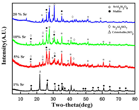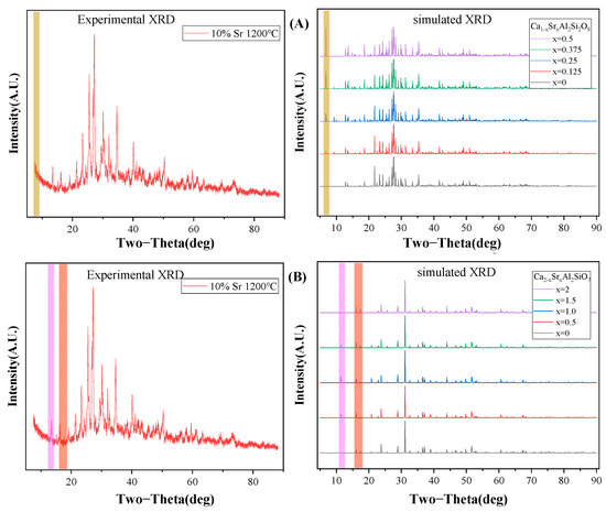 Given that allophane contains some CaO impurities, considering the isomorphism substitution, a Sr-Ca mixed-crystal phase may have existed in the solidified product after sintering. According to the doping levels of different Ca atoms, the XRD patterns of Ca1−xSrxAl2Si2O8 and Ca2−xSrxAl2SiO7 after optimization are shown in Figure 10A,B. As shown in Figure 10A, for the Sr/Ca mixed-crystal structure of SrAl2Si2O8 (simulated), an obvious diffraction peak was observed at 2θ = 6.8° with a change in the Ca/Sr ratio. The intensity of the diffraction peak increased as the Ca/Sr approached one. The XRD pattern of the experimental test revealed no obvious diffraction peak at 2θ = 6.8°. Therefore, we speculated that no mixed-crystal formation of Ca1−xSrxAl2Si2O8 occurred.
