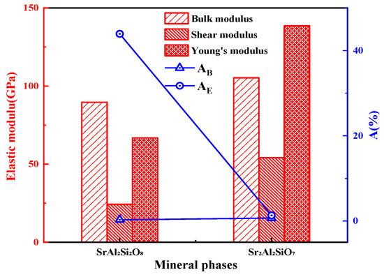 The calculated bulk, shear, and Young’s moduli of the SrAl2Si2O8 and Sr2Al2SiO7 polycrystals are shown in Figure 7. The results showed that the overall anti-deformation ability of Sr2Al2SiO7 was better than that of SrAl2Si2O8. Moreover, a larger value of A corresponds to greater anisotropy of the system, whereas when A is equal to zero, it is completely isotropic [36]. The anisotropy percentages of the bulk and shear moduli of Sr2Al2SiO7 are close to 0, further indicating that this crystalline phase is isotropic. By contrast, SrAl2Si2O8 showed obvious anisotropy.