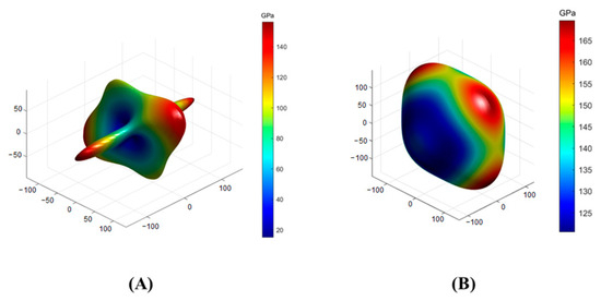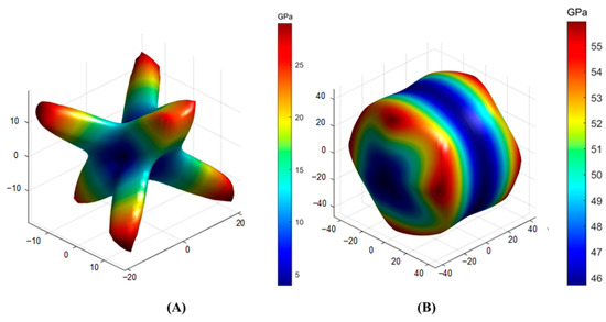 To observe the anisotropy property more clearly, the three-dimensional distributions of Young’s modulus and shear modulus were obtained through further calculation [40], and the results are displayed in Figure 8 and Figure 9, respectively. The closer the three-dimensional figure was to a spherical shape, the more isotropic the system. Obviously, SrAl2Si2O8 was more anisotropic than Sr2Al2SiO7 in terms of Young’s modulus and shear modulus.