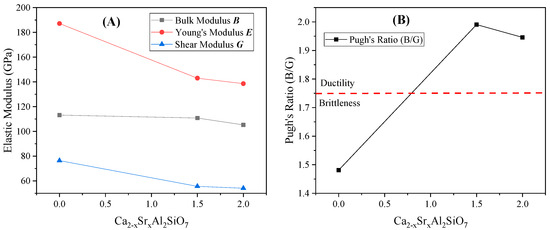 (A) Elastic modulus and (B) Pugh’s ratio of Ca2−xSrxAl2SiO7.