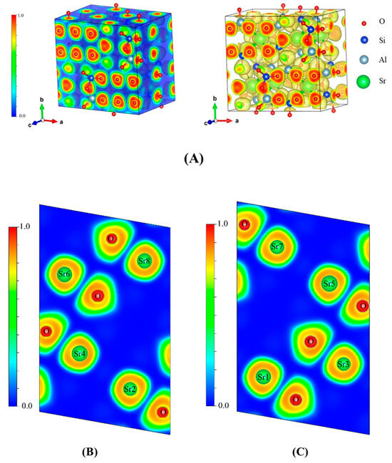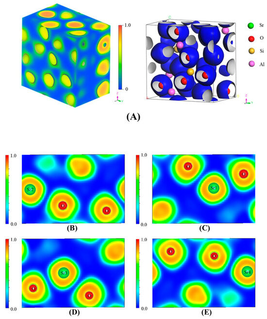 Moreover, the Sr atoms were contracted at the side that was neighboring the O atoms, and the same contraction of ELF was also observed at the O atom in Figure 12B,C [42]. Thus, Sr and O were most likely to combine with each other in the form of ionic bonds. Figure 13A shows the three-dimensional ELF diagrams of Sr2Al2SiO7, and the four Sr atoms in the crystal lattice are marked in Figure 13B–E. Similar to SrAl2Si2O8, the localization of electrons around the Sr and O atoms was relatively high. Therefore, we inferred that Sr and O also combined with each other in the form of ionic bonds in the Sr2Al2SiO7 crystal.