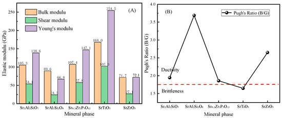 The bulk modulus B, shear modulus G, and Young’s modulus E of several Sr-containing mineral phases all exhibited the following trend: SrTiO3 > Sr0.5Zr2(PO4)3 > Sr2Al2SiO7 > SrAl2Si2O8 > SrZrO3. Among these mineral phases, SrTiO3 exhibited the best mechanical properties, whereas SrZrO3 exhibited the worst. The proportions of Sr2Al2SiO7, SrAl2Si2O8, and mullite in the solidified product changed continuously with increased Sr content. The formation of the mullite crystal phase can lead to enhanced hardness and modulus in the solidified product [28]. Therefore, a decrease in the mullite proportion may be the main reason for the decline in the mechanical properties of the solidified product. Therefore, to increase the mechanical properties of the solidified product, the content of allophane during the immobilization of Sr should be appropriately increased. The Pugh’s ratio in Figure 15B also shows that only SrTiO3 had partial brittleness, and the other ceramic solidified products had a certain ductility.