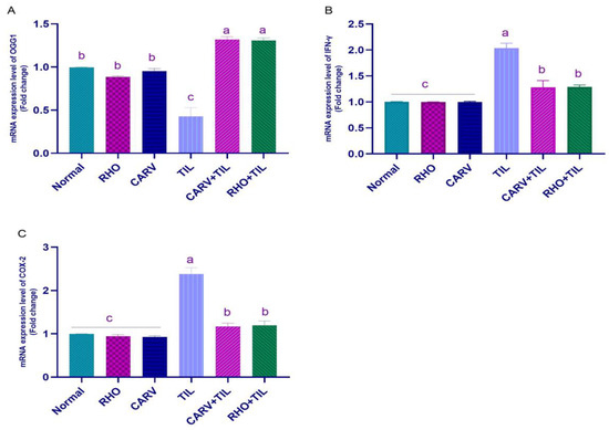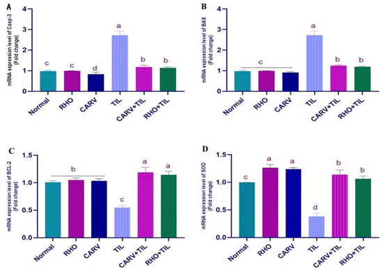 TIL upregulated the mRNA expression of INF-γ and COX-2 compared with the control, RHO, and CARV groups. In contrast, the pre-administration of RHO and CARV alone in rats protected those that received TIL, as it downregulated the examined genes significantly (Figure 3A–C). TIL upregulated the expression of apoptotic genes caspase-3 and BAX compared with control, RHO, and CARV groups and downregulated the expression of the anti-apoptotic gene BCL-2, antioxidant gene SOD, and OGG1 mRNA expression. In comparison, the pre-administration of RHO and CARV alone protected rats that received TIL, as RHO and CARV significantly decreased the mRNA expression of caspase-3, BAX, INF-γ, and COX-2 while significantly increasing the mRNA expression of BCL-2. SOD and OGG1 resorted to the examined genes (Figure 3A–D and Figure 4A).