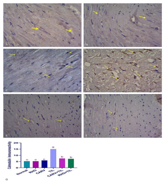 Immunohistochemical staining of calmodulin on the experimental rats’ cardiac cells (IHC, ×1000). (A–C) Control rats showing normal expression of calmodulin (brown color) (yellow arrow). (D) TIL-intoxicated rats showed a marked increase in calmodulin expression in multiple scattered foci of strong immune positivity (yellow arrow). (E) CARV + TIL-treated rats and (F) RHO + TIL-treated rats showed decreased calmodulin expression (yellow arrow). Scale bar = 50 μm. The level of positive immunoreactivity of calmodulin (G) was analyzed using a one-way ANOVA followed by Tukey’s multiple comparisons test. HMGB1 immunohistochemical staining was evaluated in 10 individual sections. All data are presented as means + SD, a,b,c Values with different letters are statistically different at p < 0.05.