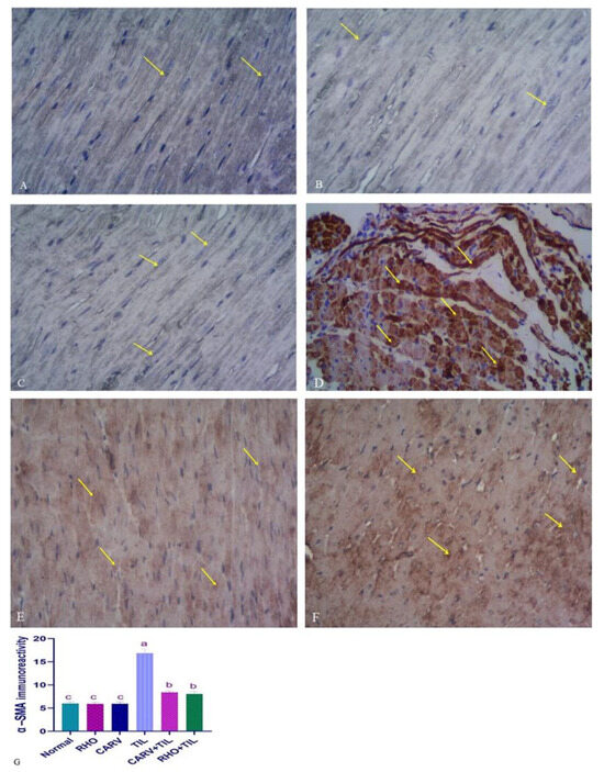 Immunohistochemical staining of alpha-smooth muscle actin (α-SMA) in the experimental rats’ cardiac cells (IHC, ×400). (A–C) Control rats show normal expression of α-SMA (brown color) (yellow arrow). (D) TIL-intoxicated rats showed a marked increase in α-SMA expression in the form of solid immune positivity (yellow arrow). (E) CARV + TIL-treated rats and (F) RHO + TIL-treated rats showed decreased α-SMA expression (yellow arrow). Scale bar = 50 μm. The level of positive immunoreactivity of α-SMA (G) was analyzed using a one-way ANOVA followed by Tukey’s multiple comparisons test. HMGB1 immunohistochemical staining was evaluated in 10 individual sections. All data are presented as means + SD, a,b,c Values with different letters are statistically different at p < 0.05.