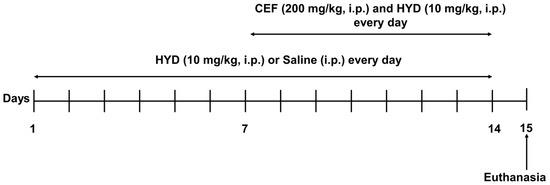 Male mice were handled three days before starting the experiment for acclimation. Mice were then divided into three groups: (1) saline group, mice were intraperitoneal (i.p.) injected with saline vehicle from day 1–14 (n = 7); (2) hydrocodone group, mice were i.p. injected hydrocodone (10 mg/kg) from day 1–14 (n = 7); and (3) hydrocodone + ceftriaxone group, mice were i.p. injected hydrocodone (10 mg/kg) from day 1–14, and ceftriaxone (200 mg/kg) was i.p. injected from day 7–14 (n = 7) (Figure 1). Hydrocodone (Sigma-Aldrich, St. Louis, MO, USA) was dissolved in saline at 10 mg/kg. Ceftriaxone was purchased from (Pfizer, Lake Forest, IL, USA) and was dissolved in saline at 200 mg/kg. Note that equal volumes of saline (control group) and hydrocodone (10 mg/kg, i.p., hydrocodone group) were injected from day 1 through 14; ceftriaxone (200 mg/kg, i.p.) was administered from day 7 through 14 for the ceftriaxone/hydrocodone group. Mice were euthanized on day 15 by CO2 inhalation as approved by UT-IACUC (Figure 1).