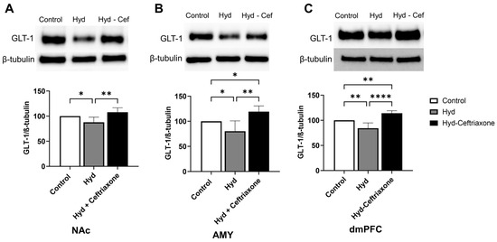 Effect of chronic hydrocodone exposure on the expression of GLT-1 in the NAc, AMY, and dmPFC. (A) Immunoblots for GLT-1 and β-tubulin in the NAc. Quantitative analysis using one-way ANOVA followed by Newman–Keuls post-hoc test indicated that GLT-1 was significantly downregulated in the hydrocodone group compared to the control group, while post-treatment with ceftriaxone (200 mg/kg) upregulated GLT-1 expression compared to the hydrocodone group in the NAc. (B) Immunoblots for GLT-1 and β-tubulin in the AMY. Quantitative analysis using one-way ANOVA followed by Newman–Keuls post-hoc test showed that GLT-1 was significantly downregulated in the hydrocodone group compared to the control group, while post-treatment with ceftriaxone (200 mg/kg) upregulated GLT-1 expression compared to the hydrocodone group in the AMY. (C) Immunoblots for GLT-1 and β-tubulin in the dmPFC. Quantitative analysis using one-way ANOVA followed by Newman–Keuls post-hoc test indicated that GLT-1 expression was significantly downregulated in the hydrocodone group compared to the control group, while ceftriaxone (200 mg/kg) upregulated GLT-1 expression compared to the hydrocodone group in the dmPFC. Control group data were represented as 100%. Each column is expressed as mean S.E.M (n = 7/group), (* p < 0.05, ** p < 0.01, and **** p < 0.0001).