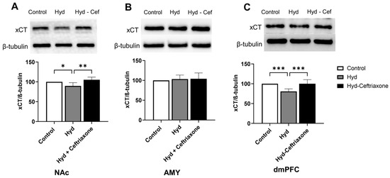 We further investigated the effects of chronic hydrocodone exposure and ceftriaxone treatment on the expression of xCT in mesocorticolimbic brain regions. There were significant differences in xCT expression in the NAc (F2,12 = 8.364, p < 0.01, Figure 3A) and dmPFC (F2,15 = 15.07, p < 0.001, Figure 3C) among all tested groups. However, there were no significant changes in xCT expression between all tested groups in the AMY (F2,18 = 0.03247, p > 0.05, Figure 3B). Newman–Keuls post-hoc analyses revealed significant decreases in xCT expression in the NAc (p < 0.05, Figure 3A) and the dmPFC (p < 0.001, Figure 3C) in the hydrocodone group as compared to the control group. Importantly, ceftriaxone attenuated hydrocodone-induced downregulation in the NAc (p < 0.01, Figure 3A) and dmPFC (p < 0.001, Figure 3C). Quantitative analysis revealed non-significant differences in xCT expression among control and hydrocodone–ceftriaxone groups in the NAc, AMY, and dmPFC (Figure 3).