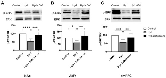We also investigated the effects of ceftriaxone on kinase signaling pathways such as p-ERK in mesocorticolimbic brain regions. Western blot data analyses revealed significant differences in p-ERK expression in the NAc (F2,14 = 19.73, p < 0.0001, Figure 4A), AMY (F2,13 = 7.141, p < 0.01, Figure 4B), and dmPFC (F2,14 = 12.44, p < 0.001, Figure 4C) among all groups. Newman–Keuls post hoc analyses revealed that chronic hydrocodone exposure decreased p-ERK expression in the NAc (p < 0.0001, Figure 4A), AMY (p < 0.05, Figure 4B), and dmPFC (p < 0.001, Figure 4C) compared to the control group. Importantly, ceftriaxone attenuated hydrocodone-induced downregulation of p-ERK in the NAc (p < 0.001, Figure 4A), AMY (p < 0.01, Figure 4B) and the dmPFC (p < 0.01, Figure 4C). No significant changes were detected between the hydrocodone and hydrocodone–ceftriaxone groups.
