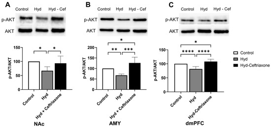 Effect of chronic hydrocodone exposure on p-AKT expression in the NAc, AMY, and dmPFC. (A) Immunoblots for p-AKT and AKT in the NAc. Quantitative analysis using one-way ANOVA followed by Newman–Keuls post hoc test indicated that p-AKT expression was significantly decreased in the hydrocodone group as compared to the control group, while ceftriaxone (200 mg/kg) normalized p-AKT expression in the NAc compared to the hydrocodone group. (B) Immunoblots for p-AKT and AKT in the AMY. Quantitative analysis using one-way ANOVA followed by Newman–Keuls post hoc test showed that p-AKT was significantly decreased in the hydrocodone group compared to the control group, while post-treatment with ceftriaxone (200 mg/kg) normalized the expression of p-AKT expression in the AMY compared to the hydrocodone group. (C) Immunoblots for p-AKT and AKT in the dmPFC. Quantitative analysis using one-way ANOVA followed by Newman–Keuls post hoc test showed that p-AKT expression was significantly reduced in the hydrocodone group compared to the control group, while ceftriaxone (200 mg/kg) normalized p-AKT expression in the dmPFC compared to the hydrocodone group. Control group data were represented as 100%. Each column is expressed as mean S.E.M (n = 7/group), (* p < 0.05, ** p < 0.01, *** p < 0.001 and **** p < 0.0001).