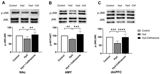 We further investigated the effect of chronic exposure to hydrocodone on p-JNK expression in mesocorticolimbic brain regions. Data analyses revealed a significant difference in p-JNK expression in the NAc (F2,14 = 7.577, p < 0.01, Figure 6A), AMY (F2,15 = 11.82, p < 0.001, Figure 6B), and dmPFC (F2,18 = 18.36, p < 0.0001, Figure 6C) among all tested groups. Hydrocodone exposure decreased p-JNK expression in the NAc (p < 0.05, Figure 6A), AMY (p < 0.01, Figure 6B), and dmPFC (p < 0.001, Figure 6C) compared to the control group. Importantly, ceftriaxone attenuated hydrocodone-induced downregulation in p-JNK expression in the NAc (p < 0.01, Figure 6A), AMY (p < 0.001, Figure 6B), and dmPFC (p < 0.0001, Figure 6C). No significant difference was found in p-JNK expression between the control and hydrocodone–ceftriaxone groups in all three brain regions (Figure 6).