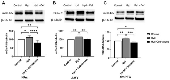 Effect of chronic hydrocodone exposure on mGluR5 expression in the NAc, AMY, and dmPFC. (A) Immunoblots for mGluR5 and β-tubulin in the NAc. Quantitative analysis using one-way ANOVA followed by Newman–Keuls post hoc test showed that mGluR5 expression was significantly upregulated in the hydrocodone group compared to the control group, while ceftriaxone (200 mg/kg) normalized mGluR5 expression in the NAc compared to the hydrocodone group. (B) Immunoblots for mGluR5 and β-tubulin in the AMY. Quantitative analysis using one-way ANOVA followed by Newman–Keuls post hoc test showed that mGluR5 was significantly upregulated in the hydrocodone group compared to the control group, while post-treatment with ceftriaxone (200 mg/kg) normalized mGluR5 expression in the AMY compared to the hydrocodone group. (C) Immunoblots for mGluR5 and β-tubulin in the dmPFC. Quantitative analysis using one-way ANOVA followed by Newman–Keuls post hoc test showed that mGluR5 expression was significantly upregulated in the hydrocodone group compared to the control group, while ceftriaxone (200 mg/kg) normalized mGluR5 expression in the dmPFC compared to hydrocodone group. Control group data were represented as 100%. Each column is expressed as mean S.E.M (n = 7/group), (* p < 0.05, ** p < 0.01, *** p < 0.001 and **** p < 0.0001).