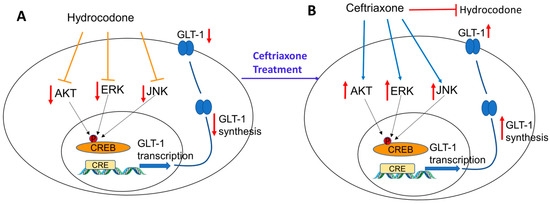 Schematic representation summarizing the effects of chronic hydrocodone exposure on GLT-1 expression in mesocorticolimbic brain regions. (A) Chronic exposure to hydrocodone reduced ERK, AKT, and JNK signaling kinases leading to GLT-1 downregulation. (B) Ceftriaxone treatment attenuated hydrocodone-induced GLT-1 downregulation by upregulating signaling kinases such as ERK, AKT, and JNK.