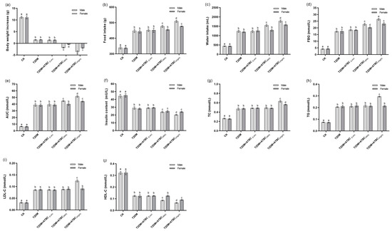 Mice were acclimatized to ND chow for one week. Then, 20 mice (10 males and 10 females) were randomly selected for ND throughout the whole experimental period, while the remaining mice were fed FD chow for four weeks and then injected with STZ (50 mg/kg) intraperitoneally. These mice were then fasted and deprived of water for 12 h before the next injection. Next, the mice were injected with STZ once every three days. As a result, the mice received a total of three STZ injections during the whole experimental period. Except for 12 h fasting before each injection, the mice were free to eat and drink water at other times. One week after the completion of three STZ injections, the mice were fasted for 12 h and their blood samples were collected from the tail vein to measure their fasting blood glucose (FBG) levels. The model was considered successful when the FBG level was >11.1 mol/L [18,19]. Then, 40 male and 40 female T2DM mice were randomly selected. Finally, 20 healthy mice (10 males and 10 females) and 80 T2DM mice (40 males and 40 females) were obtained for subsequent experiments.