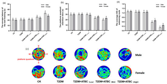 MWM test after ATBC exposure. (a) The escape latency of last training. (b) The platform quadrant retention time. (c) The swimming route (Green to red indicates the degree of concentration of the route). (d) The average OD (red) of the swimming route in the platform quadrant. Different lowercase letters indicate significant differences (p < 0.05) between groups in the plots.