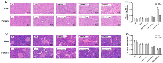 The pancreas islets and peripheral cells of mice in the CK group were regular and complete (Figure 3b). The islets were round or oval, the islet edges were clear, the islet size was normal, and the cells in islets were evenly distributed. Islets in the T2DM group showed irregular morphology and irregular edges. Islet irregularity and atrophy in T2DM mice became more pronounced after ATBC exposure, and the damage gradually increased with the increase in exposure concentration. After exposure to ATBC at a high concentration, the islets of female and male T2DM mice were still visible, but the edges and boundaries of the islets were unclear, and the morphological structure was changed. As shown in Figure 3d, the total areas of the islets of the T2DM and T2DM + ATBC(Low) groups were decreased, and the areas of the T2DM mice further reduced after medium and high concentrations of ATBC exposure, while the male mouse in the T2DM + ATBC(Mid) and T2DM + ATBC(High) group showed more reduced total islet areas.