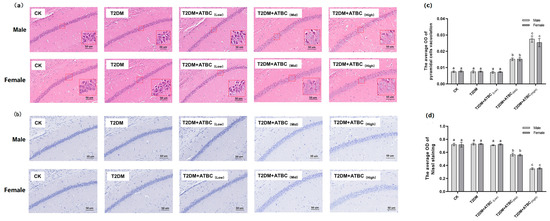 Nissl staining of the hippocampus is shown in Figure 4b. The CK, T2DM, and T2DM + ATBC(Low) groups showed the clear cytoplasmic staining of cells, but after ATBC exposure at medium and high concentrations, the cytoplasmic staining of pyramidal cells became lighter. As shown in Figure 4b, decreases in the OD of Nissl staining were observed in mice from the T2DM + ATBC(Mid) and T2DM + ATBC(High) groups.
