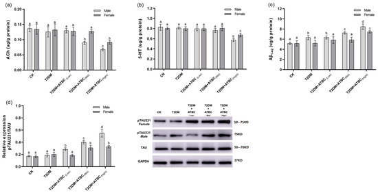 The ACh levels in T2DM mice were significantly decreased after exposure to medium and high concentrations of ATBC (Figure 5a). Gender-based differences were also observed. The decreases in female mice were lower than those in the male mice. After exposure to ATBC at high concentration, the 5-HT level changes in T2DM mouse brains showed the same trend as those for ACh (Figure 5b). The Aβ1–42 expression in T2DM male mice significantly increased compared to that in the CK group. It increased even further after exposure to medium and high concentrations of ATBC in T2DM male mice (Figure 5c). However, the Aβ1–42 expression showed an increase in T2DM female mice only after exposure to high concentrations of ATBC. The relative expression of pTAU231 increased significantly after ATBC exposure, and gender-based differences were also observed (Figure 5d).