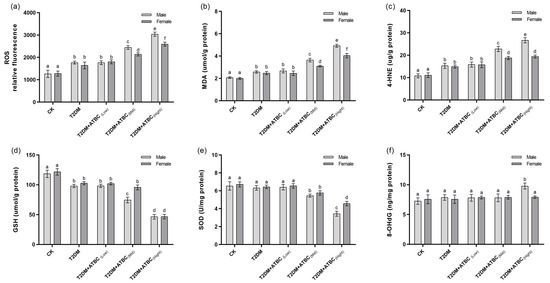 A significant increase in ROS levels was observed in T2DM mouse brains. The ROS levels increased further after exposure to medium and high concentrations of ATBC (Figure 6a). However, the increase was less pronounced in female T2DM mice than in male mice. The MDA and 4-HNE levels in T2DM mouse brains showed the same trend as those for ROS (Figure 6b,c). The GSH levels decreased significantly in T2DM mouse brains. They decreased even further after exposure to medium and high concentrations of ATBC and showed gender-based differences in the T2DM + ATBC(Mid) group (Figure 6d). The SOD activity in T2DM mouse brains decreased significantly after exposure to high concentrations of ATBC. Gender-based differences were also evident (Figure 6e). The 8-OHdG level changes in T2DM mouse brains are shown in Figure 6f. The 8-OHdG levels in male T2DM mice increased significantly after exposure to high concentrations of ATBC, while the female T2DM mice showed no changes.