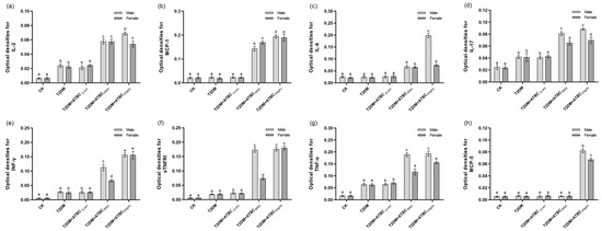 The TC, TG, and LDL-C levels of T2DM mice were significantly higher than those of CK mice, and exposure to low and medium concentration of ATBC had no effects (Figure 1g–i). However, the TC, TG, and LDL-C levels of male T2DM mice increased significantly after exposure to high concentrations of ATBC, while the female T2DM mice showed no changes in TG and LDL-C levels. The trend in HDL-C change was reversed (Figure 1j). The HDL-C levels in T2DM and T2DM + ATBC(Low) mice were significantly lower than those in CK mice. They decreased even further after exposure to medium and high concentrations of ATBC. The levels in male mice decreased more, such that there was a significant difference between male and female mice.