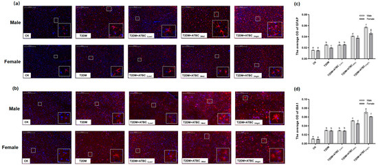In response to ATBC espouse, glial cells became more intense after exposure to medium and high concentrations of ATBC. And astrocytes were characterized by an increased GFAP-positive cell body volume and more ramified branches (Figure 8a). Significant increases in GFAP expression levels were observed in the T2DM- and T2DM + ATBC(Low)-group mice compared to the CK-group mice. And the expression level increased gradually after exposure to medium or high concentrations of ATBC (Figure 8c). They experienced IBA1-positive cell size increases, neurite retraction and coarsening, and spines appearing on the neurites (Figure 8b). Similar to GFAP expression, significant increases in IBA1 expression levels in the T2DM- and ATBC-exposure-group mice were observed (Figure 8d). And the male mouse brain in the T2DM + ATBC(Mid) and T2DM + ATBC(High) group showed more increased GFAP and IBA1 expression.