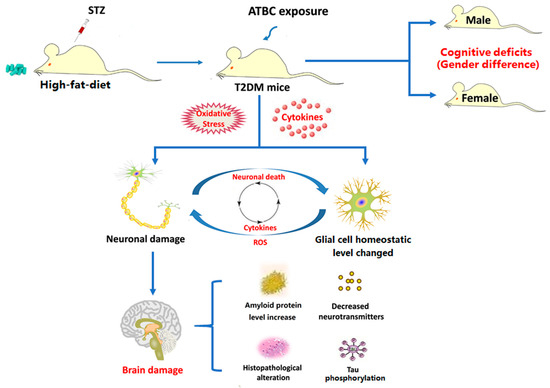 Studies have demonstrated that oxidative stress is one of the essential mechanisms for the pathogenesis of diabetes [38,39]. Brain tissues are more susceptible to oxidative stress due to their high oxygen consumption, high lipid content, and low antioxidant capacity [40]. The studies on gender differences in oxidative stress have shown that females may exhibit greater antioxidant capacity. These differences may be caused by differences in sex chromosomes, the expression of sex-specific genes on autosomes, sex hormones, and their effects on the organs and systems [41,42]. In the present study, the oxidative stress level changes after ATBC exposure were determined. The results showed that ROS and lipid peroxidation levels (MDA, 4-HNE) increased and GSH levels decreased, while SOD activity and 8-OHdG levels did not change in the brain tissue of T2DM mice. However, exposure to medium and high concentrations of ATBC aggravated the ROS levels. Furthermore, lipid peroxidation increased and GSH levels decreased. In addition, SOD activity decreased significantly, while 8-OHdG levels increased. Gender-based differences were also evident. These results indicate that the levels of oxidative stress in the brain tissues of T2DM mice of different genders were differentially increased after exposure to medium and high concentrations of ATBC.