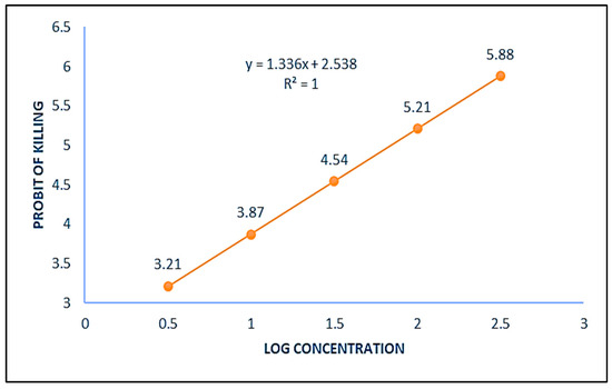 Graph showing relationship between the probit of kill and log of different concentrations of ZnO NPs showing the probit regression line and equation.