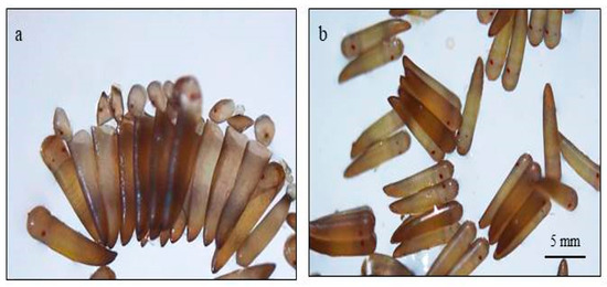 - Crozier, R. An acetic acid dissociation, air-drying technique for insect chromosomes, with aceto-lactic orcein staining. Stain Technol. 1968, 43, 171–173. [Google Scholar] [CrossRef]