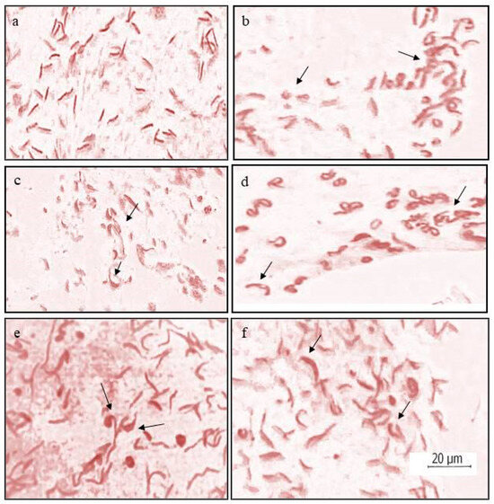 Different types of sperm head abnormalities induced by ZnO NPs in Culex quinquefasciatus (a) normal sperms; (b) twisted; (c) sickle shaped and vesicular; (d) vacuolated and twisted; (e) vacuolated oval and triangular; (f) sickle shaped.