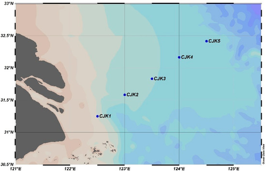 The study area is located in the sea area off the Yangtze River estuary, with five stations (31.25°~32.42° N, 122.5°~124.5° E), and the section direction was laid out to coincide with the direction of the freshwater flushing in the Yangtze River estuary. Sampling was carried out in May 2017 (spring), November 2017 (autumn), February 2019 (winter), and August 2019 (summer), and the sampling stations are shown in Figure 1.