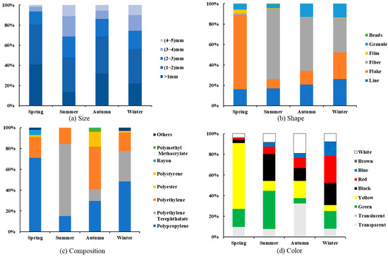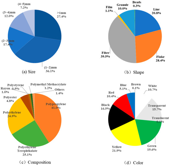 In spring, microplastics with a particle size of less than 1 mm were the most abundant, accounting for 41.0% of the total, followed by (1–2) mm, accounting for 39.3%. The main shapes of microplastics were flake and line, accounting for 72.8% and 16.2%, respectively; the main compositions were polypropylene and polyethylene, accounting for 71.0% and 20.0%, respectively; and yellow and green microplastics were the most numerous, accounting for 63.8% and 17.2%.