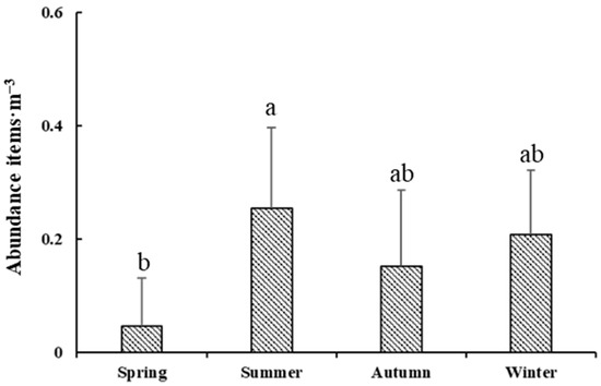 Comparison of microplastic abundance in different seasons. The letter indicated significant difference in Mann–Whitney U-test (p < 0.05).
