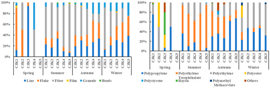 Lower levels of microplastics were found in the farshore region in spring, especially in CJK5, where no microplastics were detected. Due to seasonal changes, the runoff from the Yangtze River gradually increases, the direction of freshwater flushing shifts from the southeast to the northeast, and the prevailing wind shifts from northerly to southeasterly, so microplastics are less likely to accumulate in this area, and thus, the abundance is lower relative to fall and winter.