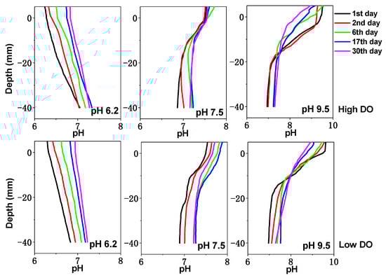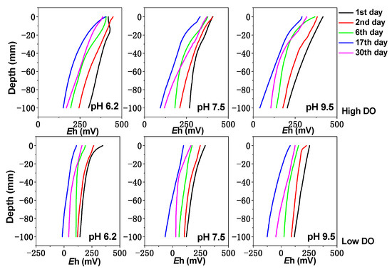The pH and Eh value changes of the sediment are shown in Figure 1 and Figure 2. Under high and low DO conditions, the Eh value of the sediment shows a trend of initially decreasing and then increasing. Under initial pH 9.5 conditions, the potential decrease was the most significant. In the early stage of high DO cultivation, the difference in the sediment Eh was not significant between different pH conditions; then, the sediment Eh under initial pH 6.2, 7.5, and 9.5 conditions decreased to ranges of +149 to +386 mV, +118 to +372 mV, and +105 to +319 mV, respectively, at the end of cultivation. However, under low DO cultivation, the sediment Eh under initial pH 6.2, 7.5, and 9.5 conditions decreased to ranges of −16 to +112 mV, −67 to +99 mV, and −125 to +81 mV on day 17 and then slowly increased. This phenomenon can be attributed to the consumption of organic matter in sediments by microorganisms whose activity was then inhibited [33], leading to a gradual increase in the redox potential by day 30. Therefore, both the initial pH and DO have a significant impact on sediment Eh. From Figure 2, it can be seen that under initial pH 6.2, 7.5, and 9.5 conditions in the early stage of cultivation (0–6 days), the pH values at the sediment–water interface (0 to −2 cm) were greatly influenced by the initial pH of the overlying water. With the increase in cultivation time, the pH at the sediment–water interface changed due to the buffering effect of the sediment. After cultivation, the pH at the sediment–water interface under initial pH 6.2 and 9.5 conditions varied within ranges of 6.83–7.09 and 7.47–8.71, respectively, while under initial pH 7.5 conditions, the pH value at the sediment–water interface was similar to the initial pH value, ranging from 7.21 to 7.66. Compared to high DO conditions, the pH value at the sediment–water interface was slightly larger during low DO cultivation, which might be more favorable for proton consumption under low DO reducing conditions. Therefore, the initial pH and DO of the water had a certain influence on sediment pH.