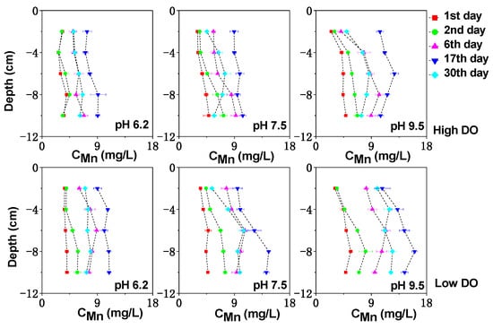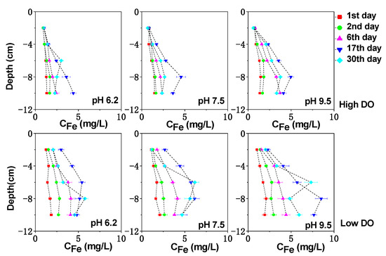 The vertical distribution of dissolved Fe, Mn, and S in the sediment can be seen in Figure 3, Figure 4 and Figure 5. Under high DO conditions, the profiles of dissolved Fe and Mn were similar. In the initial stage of cultivation (0–6 days), the concentrations near the sediment–water interface (0–2 cm) were low, and the peaks mainly occurred in the deeper sediment. Especially at an initial pH of 9.5, the concentrations of dissolved Fe and Mn near the sediment–water interface were the lowest compared to other initial pH conditions, ranging from 0.76 to 0.82 mg/L and 2.47 to 4.07 mg/L, respectively, as both Fe and Mn could be oxidized and precipitated easily under strong alkaline conditions. As the cultivation progresses, the sediment pH changed to neutral or weak alkaline conditions. Due to the abundant presence of easily biodegradable organic matter in the sediment of Zhushan Bay in Lake Taihu [34], strong mineralization occurred and the deep sediment was in a weak reducing environment (+100 mV–+200 mV) (Figure 1). The reduction in Fe/Mn-OOH intensified, and the concentrations of dissolved Fe and Mn further increased and gradually migrated to the upper layer (Figure 3).