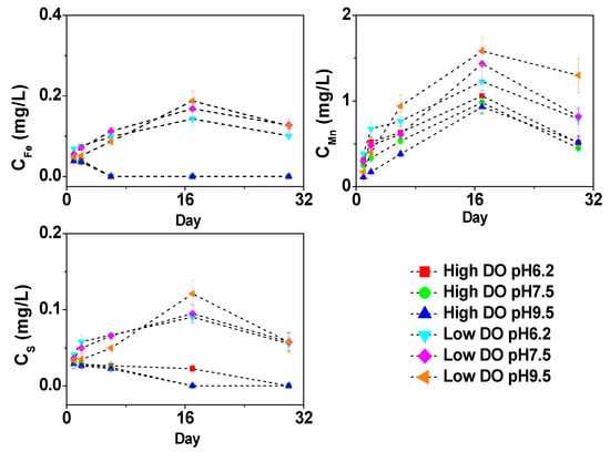 During the cultivation process, changes in the dissolved forms of Fe, Mn, and S in the overlying water also occurred (Figure 6). In a high dissolved oxygen (DO) environment, dissolved oxygen has a greater inhibitory effect on the oxidation of dissolved Fe and S in the water. The concentration of dissolved Fe in the overlying water gradually decreased until it was below the detection limit, and the concentration of dissolved S also decreased gradually. Mn(II) usually undergoes oxidation under conditions with a pH ≥ 9 [42], while the overlying water in the cultivation process remained within a neutral to weakly alkaline range (pH < 9), which is not conducive to the oxidation of Mn. Therefore, dissolved Mn can still be detected in the overlying water. During the first 6 days of cultivation, there were significant differences in the concentration of dissolved Mn in the overlying water under different pH conditions (p < 0.05). Subsequently, as the water pH changed to neutral or weakly alkaline, there were no significant differences in the concentration of dissolved Mn in the overlying water under different pH conditions. On the 30th day, the concentration of dissolved Mn in the overlying water was 0.51 mg/L (pH 6.2), 0.45 mg/L (pH 7.5), and 0.52 mg/L (pH 9.5).