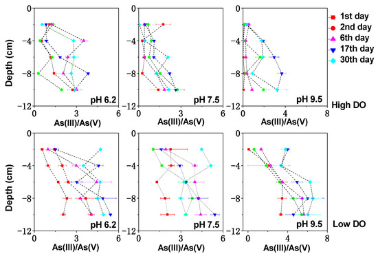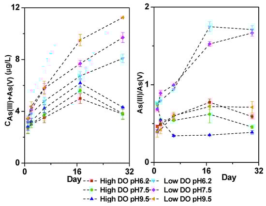 Under low DO and pH 9.5 conditions, the microbial activities related to As transformation, such as arsenate-reducing bacteria, iron-reducing bacteria, and sulfate-reducing bacteria, were generally less active under alkaline conditions [50]. Therefore, during the initial 0–6 days of low DO and pH 9.5 cultivation, the release of As was mainly governed by chemical reactions such as ion exchange and the chemical reduction in Fe/Mn-OOH. By the 17th day, when the pH of the water decreased to weakly alkaline conditions, microbial activities gradually recovered. With the sediment in a stronger anaerobic environment (Figure 1), there was an increasing trend of arsenate being reduced to arsenite. By the 30th day of cultivation, the concentrations of dissolved As(V) + As(III) and the As(III)/As(V) ratio continued to increase to 71.31 μg/L and 5.20, respectively.