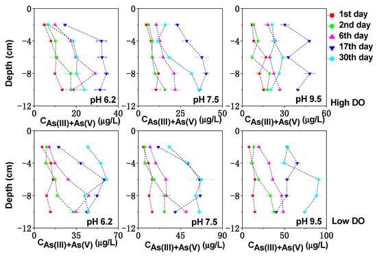 Under high DO and pH 7.5 conditions, the Fe/Mn-OOH at the sediment–water interface was relatively stable and could adsorb or co-precipitate with dissolved As, which is why there was no noticeable change in the concentration of dissolved As(V) + As(III) at the sediment–water interface on the first and second days of cultivation (Figure 8). Although the system was under high DO cultivation, the penetration depth of DO was limited and could not provide sufficient electrons for organic matter decomposition. Due to the abundant organic matter content in the Zhushan Bay sediment, microbial decomposition of organic matter required a large number of electrons. Therefore, the reduction in Fe/Mn-OOH could still occur in the deeper sediment layers when oxygen supply was insufficient. The average concentration of dissolved As(V) + As(III) in the pore water increased from the initial 8.64 μg/L to 33.32 μg/L on the 17th day and then decreased, following a similar trend as the changes in dissolved Fe, Mn, and S in the pore water under the same conditions. Therefore, under high DO and pH 7.5 conditions, the oxidation of arsenic sulfides and the reduction dissolution of Fe/Mn-OOH might be the main sources of dissolved As.