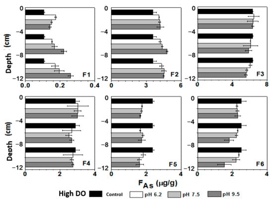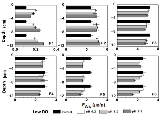 Under low DO conditions, the average concentration of exchangeable As (weakly exchangeable As + strongly exchangeable As: F1 + F2) in sediment increased from 3.68 μg/g to 4.58 μg/g (pH 6.2), 4.68 μg/g (pH 7.5), and 4.84 μg/g (pH 9.5). The content of exchangeable As increased with depth, indicating a greater conversion of other forms of bound As to exchangeable As with the increase in reduction conditions. Fe/Mn-OOH-As could be divided into amorphous Fe/Mn-OOH-As and crystalline Fe/Mn-OOH-As. The reduction dissolution of amorphous Fe/Mn-OOH-As significantly contributed to the increase in the concentration of dissolved As, with its average content decreasing from the initial 6.34 μg/g to 5.82 μg/g (pH 6.2), 5.77 μg/g (pH 7.5), and 5.64 μg/g (pH 9.5). After the cultivation under initial pH 9.5 conditions, although the overlying water was in a weakly alkaline environment, the low Eh prevented the formation of FeOOH or MnOOH precipitation from dissolved Fe(II) and Mn(II) at the sediment–water interface. As a result, there was also a significant decrease in amorphous Fe/Mn-OOH-As at the sediment–water interface. From Figure 10, it can be seen that the decrease in amorphous Fe/Mn-OOH-As was most pronounced in the deep sediment. In an anaerobic environment, amorphous Fe/Mn-OOH-As underwent reduction dissolution, leading to the dissociation and release of associated As due to the loss of adsorbents. Some of the released As entered the pore water, increasing the concentration of dissolved As. Another portion of As can be re-adsorbed and converted into exchangeable As by the solid phase.