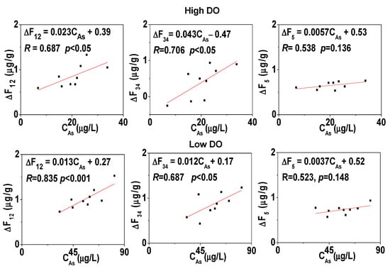 During the cultivation process, the average concentration of dissolved As in the pore water showed a certain correlation with dissolved Fe and Mn (Table 2), indicating that the reduction dissolution of sediment Fe/Mn-OOH promoted the release of As, which was consistent with many previous research conclusions [51,52]. Under low DO conditions, due to the strong reduction ability of As itself, the correlation between As and Fe (or Mn) was influenced and was lower than that under high DO conditions. In the low DO cultivation process, the correlation between dissolved As and dissolved S was higher than that under high DO conditions, indicating that the generation of soluble S promoted an increase in dissolved As under low DO conditions. Under low DO conditions, sediments were subject to strong reducing conditions, and sulfates were easily reduced by sulfate-reducing bacteria to form soluble sulfides. During this process, soluble sulfides were likely to combine with ferrous to form iron sulfide complexes (FeS or FeS2) [53,54], causing a transformation of strongly adsorbed solid phases of dissolved As and further facilitating the release of As.