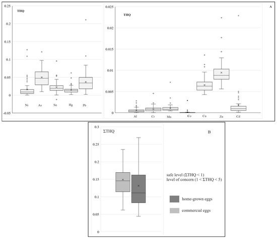 Target Hazard Quotient (THQ) associated with the exposure to different heavy metals detected in the analyzed eggs samples (A) and the sum of individual Target Hazard Quotient (B). The line across the boxes represents the median value. Whiskers indicate the higher and lower values in the entire data range. The symbols “x” represent the mean markers.