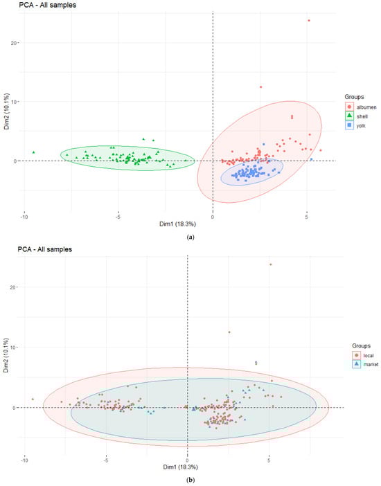 The statistical analysis was conducted using R 4.2.1 with the FactoMiner (version 2.9) and mixOmics (version 3.18) packages for multivariate data analysis [54,55,56]. This study comprised 70 egg samples, with 15 sourced from the supermarket and 55 sourced from local farms. Chemometric fingerprints were measured for each sample’s yolk, albumen, and eggshell, resulting in an initial dataset of 210 observations and 66 variables. Two discrete variables in the dataset indicate each sample’s egg part and rearing system of laying hen. In comparison, the remaining 64 variables measure the elemental composition in mg/kg of macro-minerals, heavy metals, toxic heavy metals, rare earth critical technological critical elements (TCEs), platinum group elements (PGEs), alkaline metals, alkaline earth metals, and transition- and post-transition metals. The dataset contains no missing values.