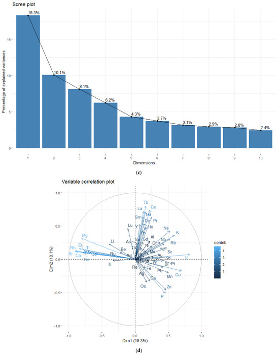 Final PCA results after removing the outliers from the dataset: (a) samples plotted on the first two dimensions, grouped based on the egg components; (b) rearing growing system of hens; (c) scree plot for the first ten dimensions of the final PCA; (d) variable correlation plot on the first two dimensions. Grouped variables are positively correlated, while those on opposite sides are negatively correlated. A lighter blue gradient corresponds to a higher variable contribution to the two principal components.